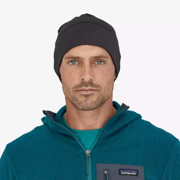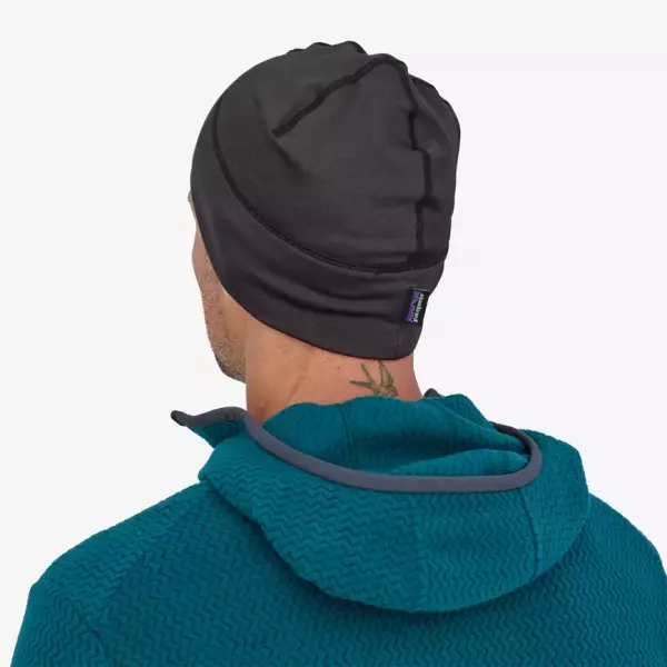 雪山登山で活用する帽子はR1デイリービーニーを使用しています。伸縮性に優れ吸湿発散性を備えたリサイクルポリエステルなので、汗を素早く吸って乾いてくれます。フードをかぶった時に邪魔になりづらく、またヘルメットとの相性も良く、耳の上から被せれば耳を温めることも可能です。