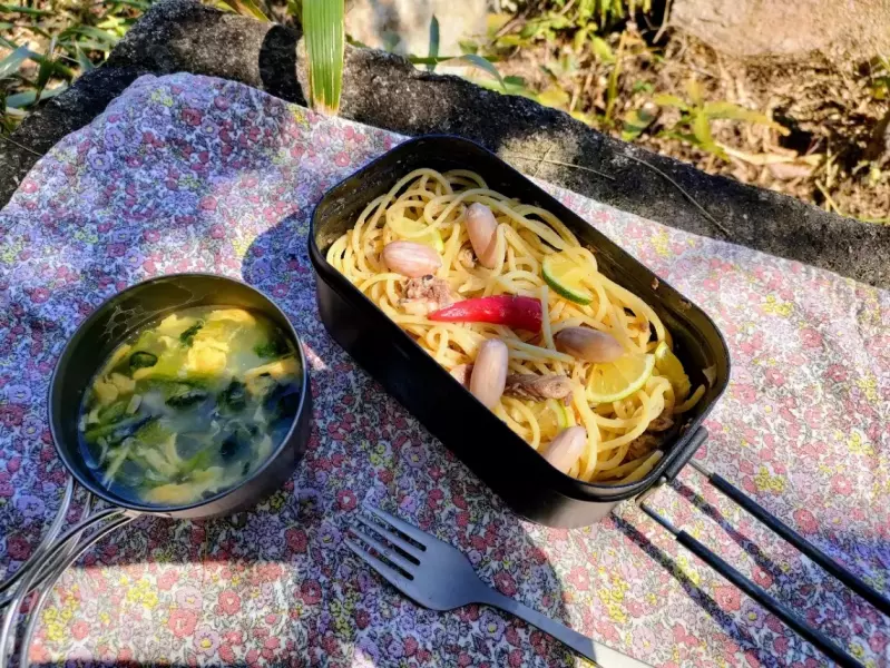 ②メスティン(1.5合用)に湯を沸かし生パスタを茹でます。