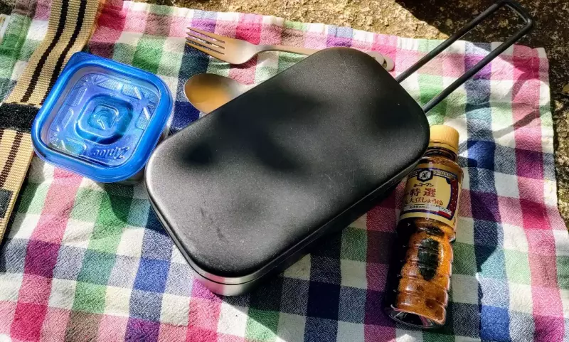 取り出したのはご飯が入ったメスティンとタッパーと醤油。この三点セットだけです。