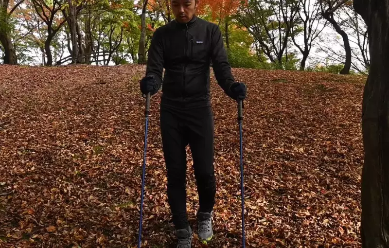 トレッキングポールを前に突くことで前かがみ姿勢になりやすく重心が支持脚からずれてしまいがちです。