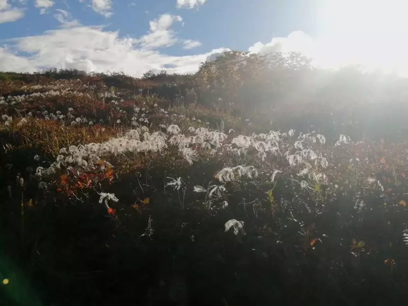 秋の光に照らされるチングルマ。風でなびく様子も風情があり美しい。