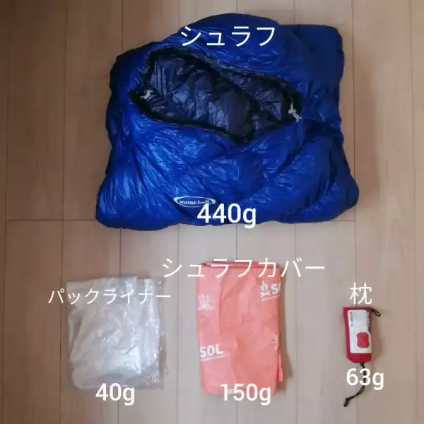 重量としては、シュラフ、カバー、ダウンブランケットを合計すると781g。軽量とは言えない重量になってしまいました。軽くて温かいシュラフは高価でなかなか手が出せず、手持ちの道具で試行錯誤しています。