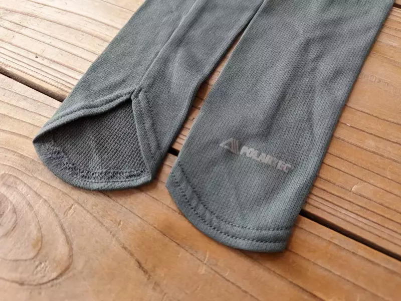 素材の厚みは、それぞれの素材に番手があるため、製品によって異なってきます。今回紹介しているポーラテックのアームカバーについては、パワーグリットの方が厚みがあり保温力に優れています。