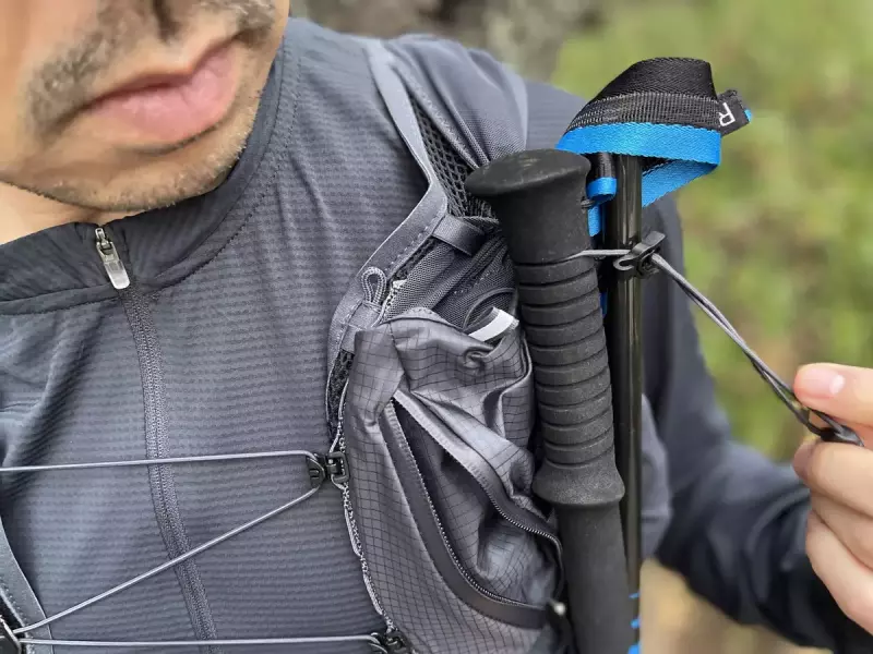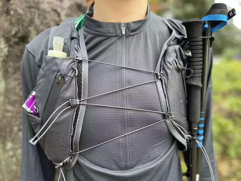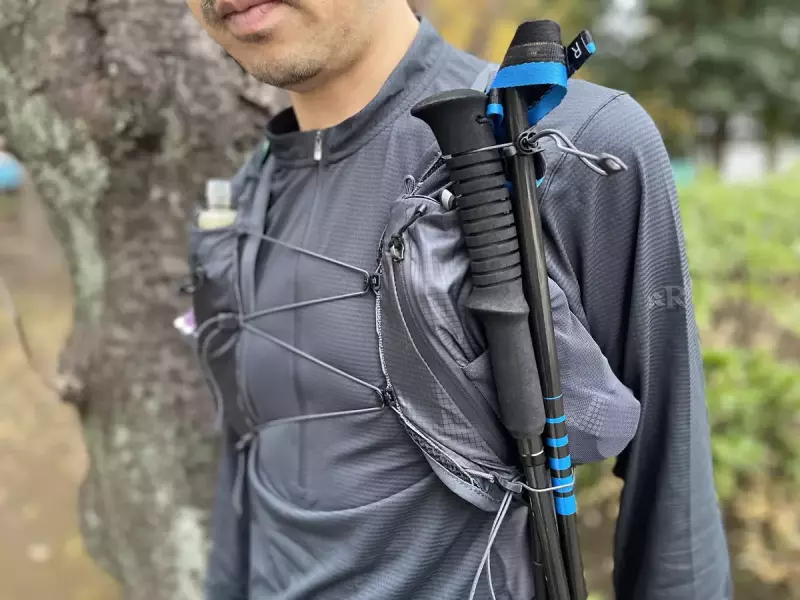 ザックのフロント部分の上下にドローコードがついており、トレッキングポールを固定することができます。素早く行動したいニーズを叶えたデザインでトレイルランニングレースの使用にも適しています。