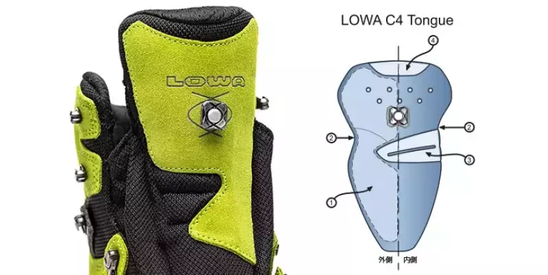 厳しいコンディションで登山靴のシューレースを締めることを想定したC4タングとXレーシングを採用しています。これは足首の可動域を考慮した立体的なデザインをタング部分に採用しサポート力を必要とする足首の外側にはフィット感を高めるための固めの素材を使用しています。フィット感と可動域を組み合わせたバランスの良い登山靴にしあげています。