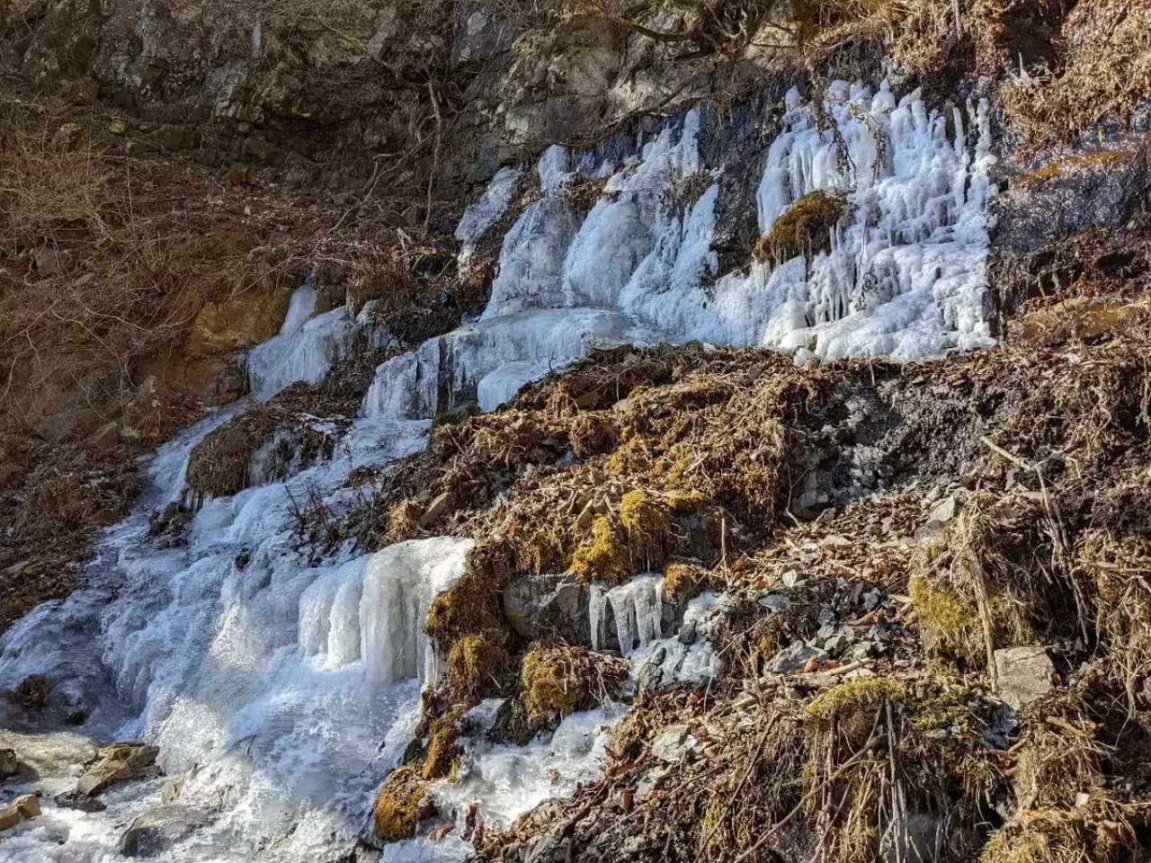 真冬の季節は登山道脇の湧き水が凍っており、橋が架けられている登山道にまで凍り付いている箇所がありました。長い距離ではありませんがカチカチに凍っているのでつるつるに滑ります。山頂付近には積雪もあるので、冬季にはチェーンスパイクや軽アイゼンが必要です。