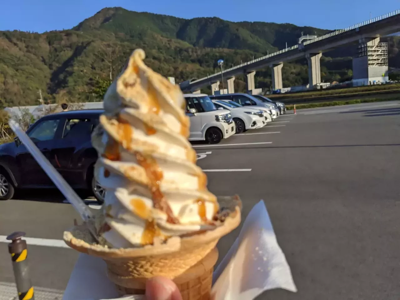 三つ峠山を下山後のお楽しみは、車で少し移動してリニア新幹線がすぐ脇を走る『道の駅つる』に立ち寄ってはいかがでしょうか。新鮮野菜を購入できるのはもちろんうれしいですし、一番のお目当ては信玄ソフトです。濃厚ソフトクリームにきなこと黒蜜シロップがトッピングされておりとても美味しいです。