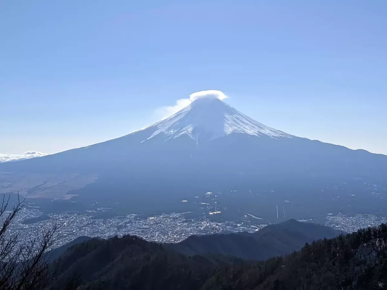 三ツ峠山(開運山)山頂からは遮るものが無く富士山を眺めることが出来ます。大きく裾を延ばす雄大で美しい姿、麓に広がる街並み、ため息が出るほどの美しさです。