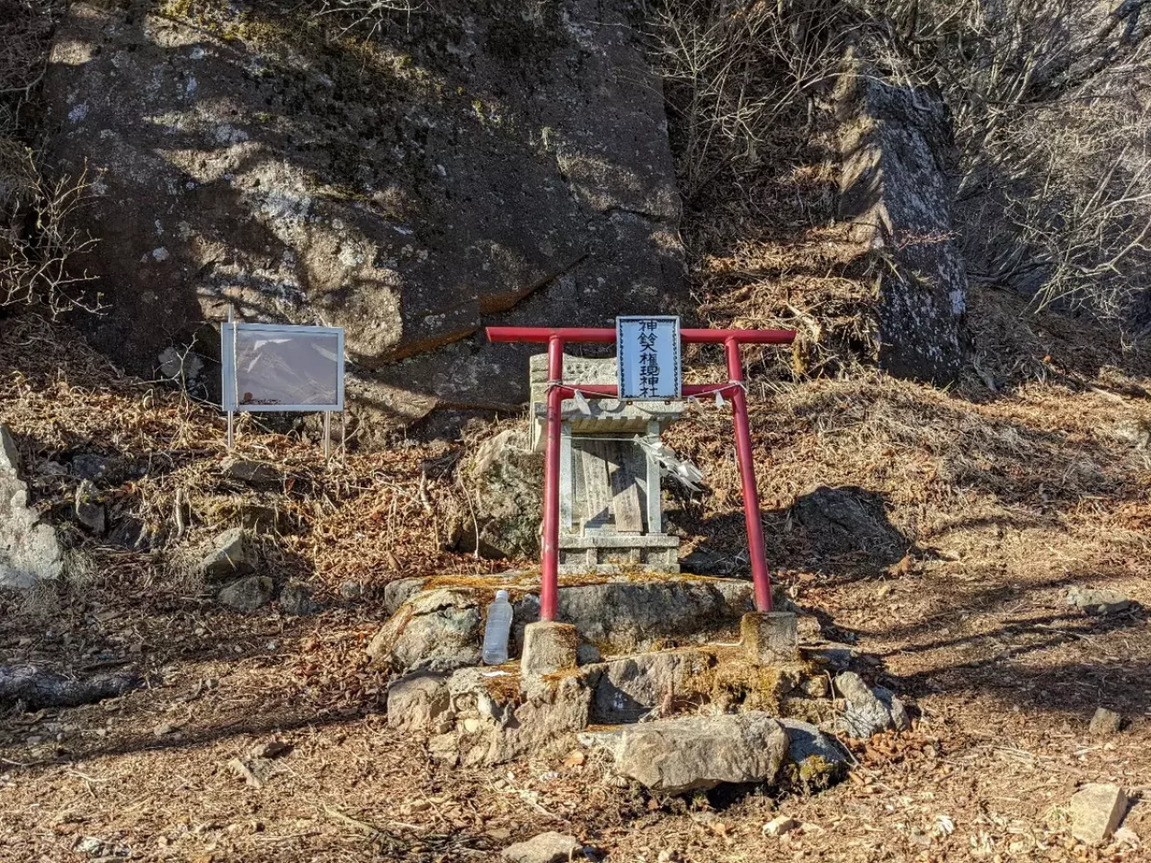 登山道に案内があり登山道より外れて少し入っていくと石の社が祀られています。三つ垰山を修験道では神鈴峰と言われます。権現は仏さまが神様の姿になって表れるときに使われる表現ですので、三つ垰山をご神体として神様が祀られているようです。