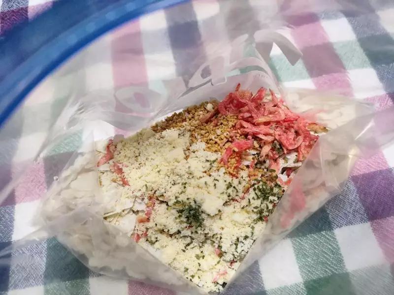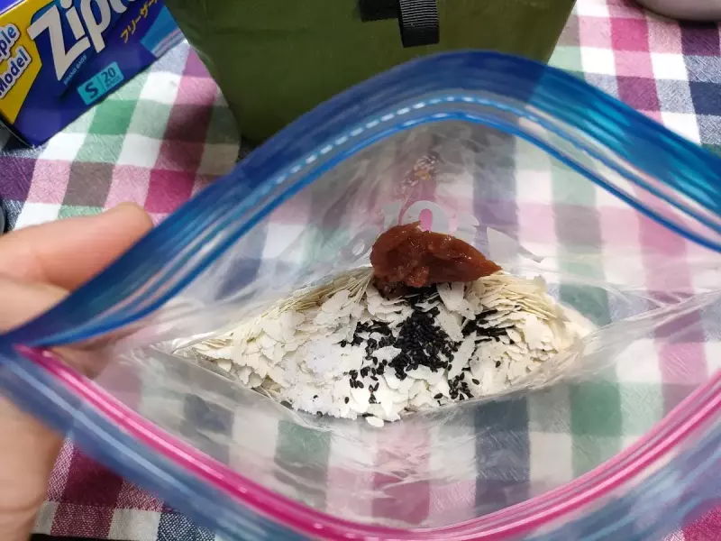 - 熱湯以外の材料を全てジップロックに入れて携行します。