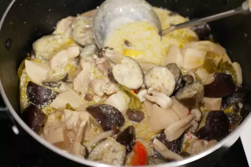 この後にじっくり15分煮込んだ方が、具がクタクタの美味しいグリーンカレーになりますよ! また、お好みでタケノコを加えるのも個人的におすすめです♪登山の準備をしている間に、ほっときでさらに美味しくしましょう!