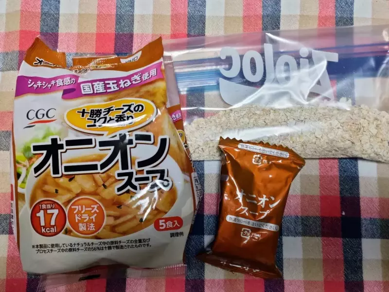 1食分は30gです。ジップロックSサイズにオートミールとオニオンスープを入れて携行します。