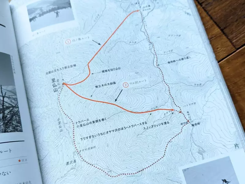 1/25000の上に描かれたハイクアップルートと、滑走ルートが描かれており、地図読みを勉強するのにも役立つ優れたバイブルとなるでしょう。