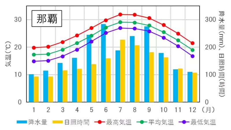 以下のグラフは沖縄の降水量と日照時間です。11月から2月が最も降水量が少ないです。気温は12月が18〜22度と東京の4〜12度と比較しても非常に暖かいことが分かります。