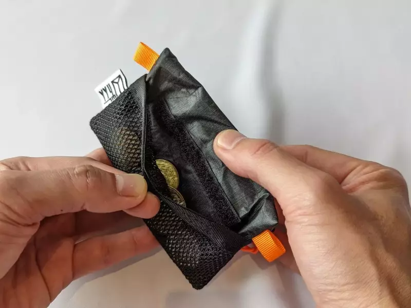 ファスナーポケットとメッシュポケットの非常にミニマムなデザインの財布です。