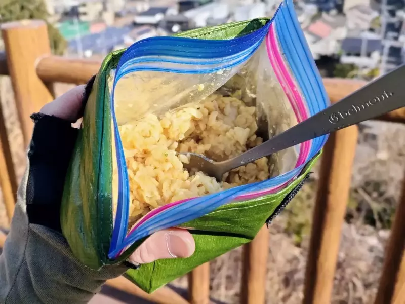 お湯が沸いたところで、ジップロックに熱湯を【300㏄】注いだらすぐフタを閉め3分間出来上がりを待ちます。ライスフレークもスープカレーワンタンも出来上がりが3分なのでこの組み合わせは神です!(上の写真はお湯を注いだ直後のもの)