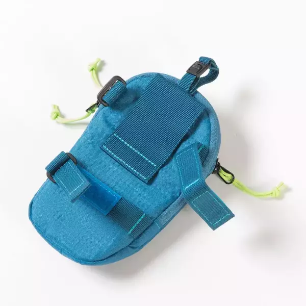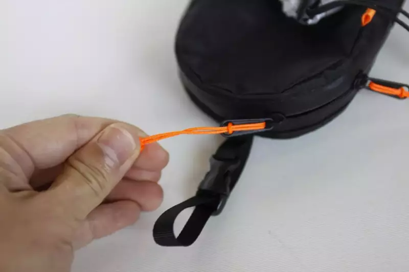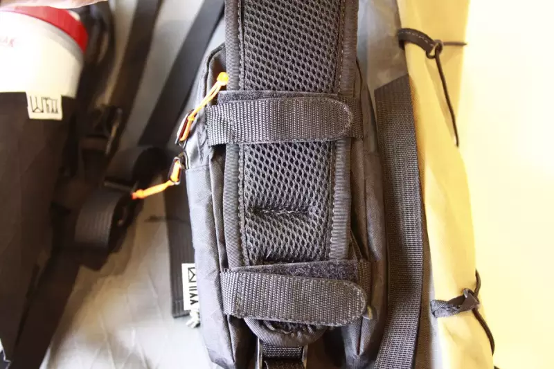 縦にも横にも取り付けることができるストラップ付きで、ショルダーハーネスだけでなくウエストベルトにも取り付けることができるように作られています。 ショルダーハーネスに取り付ける時のベルクロテープが短いので、ザックの大きさを確認するようにしましょう。