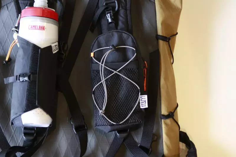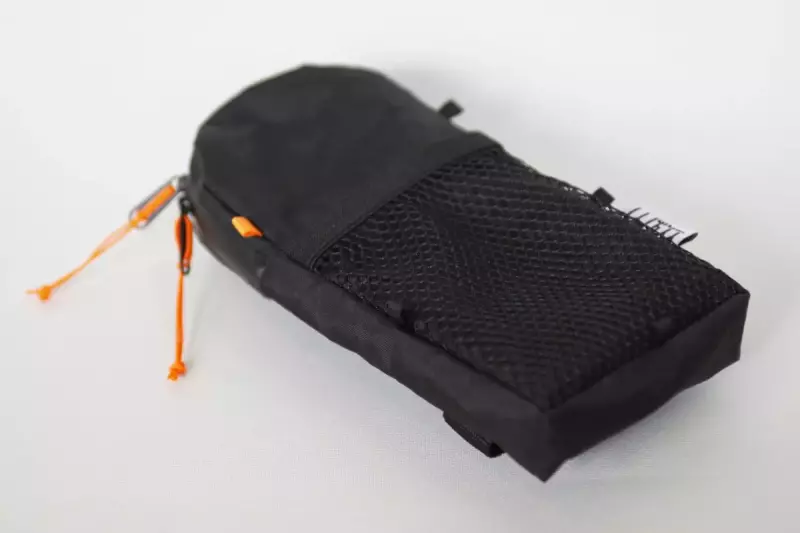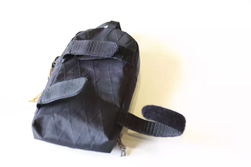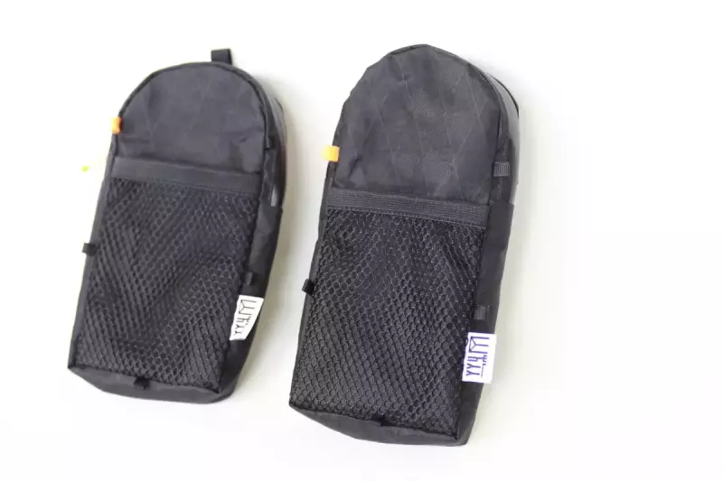 スマートフォン以外にも財布や小物、地図などを固定してショルダーハーネスに装着できるX-PAC製の軽量スマホポーチです。外側にはメッシュポケットが備わっており同ブランドの軽量な財布がシンデレラフィットするように作られています。使用しているX-PACは210d リップストップ・ナイロンの表地で軽量で耐久性があり防水性を備えています。