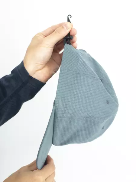 伸縮性と弾力性のあるストラップの先にプラスチック製のクリップが付いており、ストラップが邪魔になるような事がありません。ザックの雨蓋付近にあるストラップとキャップを連結させて使えば、強風でもキャップが飛ばされないので、安心して歩けます。