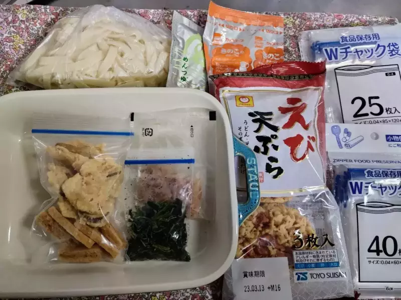 「食品に使用不可」と書いてある保存袋もあるので必ず「食品にも使える」タイプのものを使ってください。写真の「Wチャック袋」は食品保存用で百均で購入しました。えび天ぷらは丸ごと使いたかったのでパッケージのまま持っていきました。