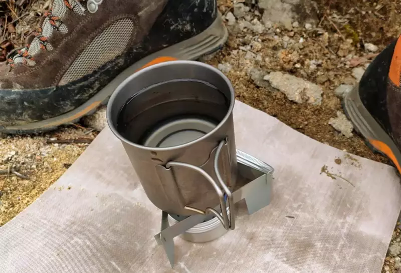 320mlの水を使って湯を沸かします。軽量化を意識して今回はチタンマグカップ(容量420ml)とアルコールストーブを使っています。