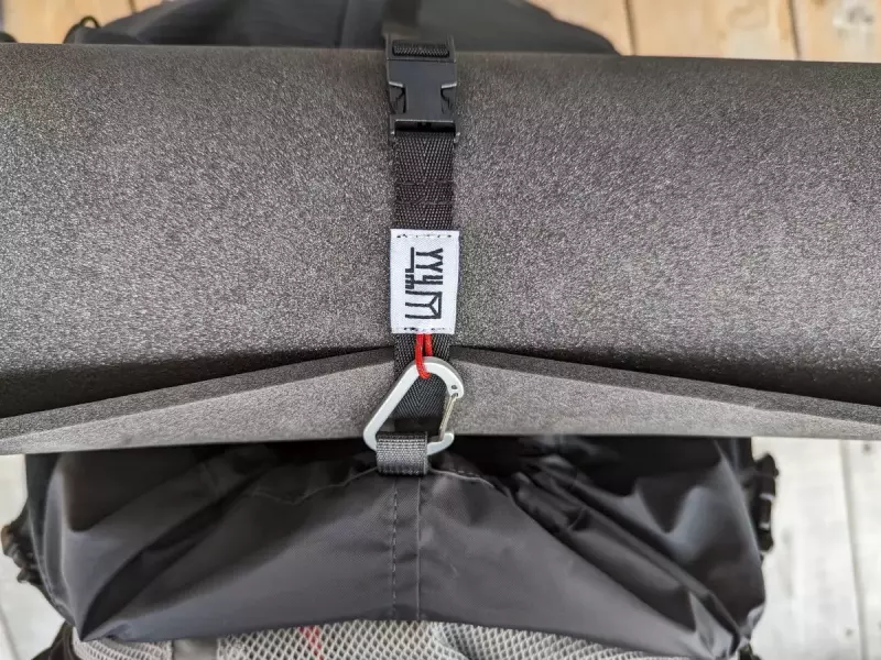 風に飛ばされやすいマットなので、ロールしてまとめた後にカラビナを使ってザックに固定しておくことができます。山旅ロックストラップにはループが備わっているので、カラビナを簡単に取り付けることができます。
