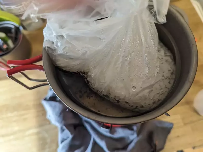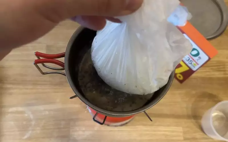 お湯が沸いたらポリ袋を入れて約25〜30分湯煎をします。今回使用しているクッカーはエバニューのTi570カップです。非常に小さく55gと軽量なクッカーなので湯煎をするときにお湯が溢れやすいので火加減に注意が必要です。