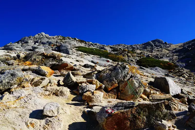 地面は花崗岩の砂で滑りやすくなっています。甲斐駒ヶ岳の登りは疲れはしますが、何とか登れるはずです。登山は「下りがむずかしい」と聞いたことはありませんか。少し自信のない方はヘルメットを持参するのもよいかもしれませんね。