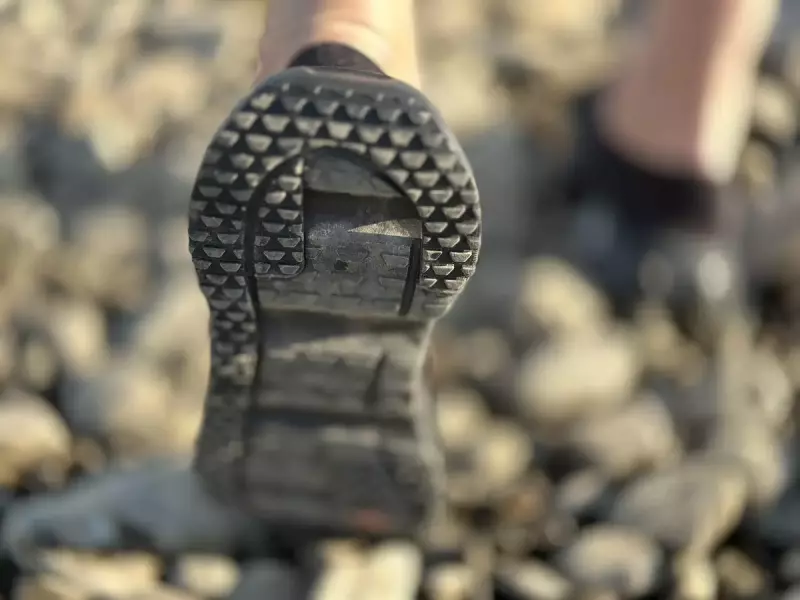 アウトソールを見ると横方向に6つの溝があり歩く時に足裏に負担をかけないように歩きをサポートする柔軟性があります。また黄色いラバー素材の部分は親指と足の外側のグリップを強めることで様々な路面で安心して歩くことができるように考えられています。