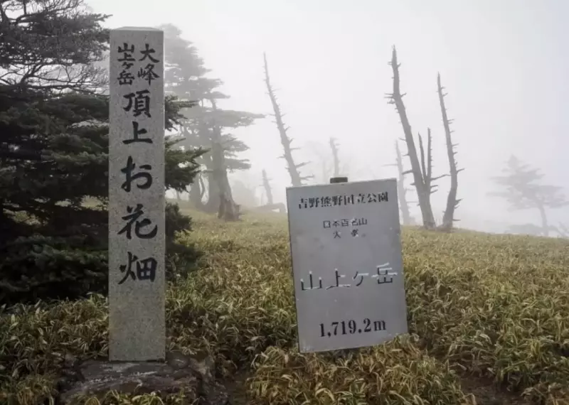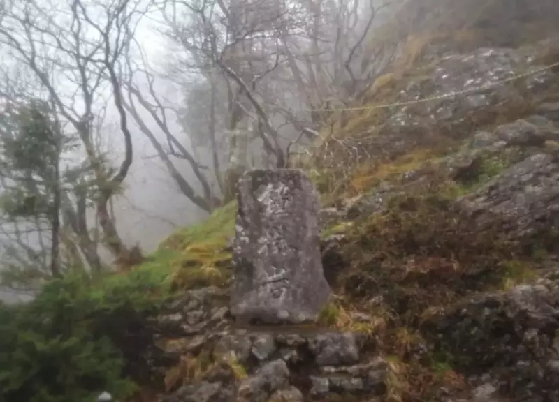 山上ヶ岳の山頂です。大峯山寺本堂(奥駈道)から少し外れたところにあります。視界が晴れないので先に進みます。※絶景ポイント「日本岩」があります。