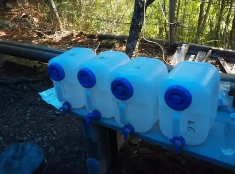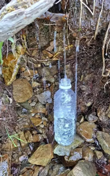 小屋の前に汲み置き水が並べられていました。ありがたいです。500補給させてもらいました。水場は400mほど下ったところにあります。