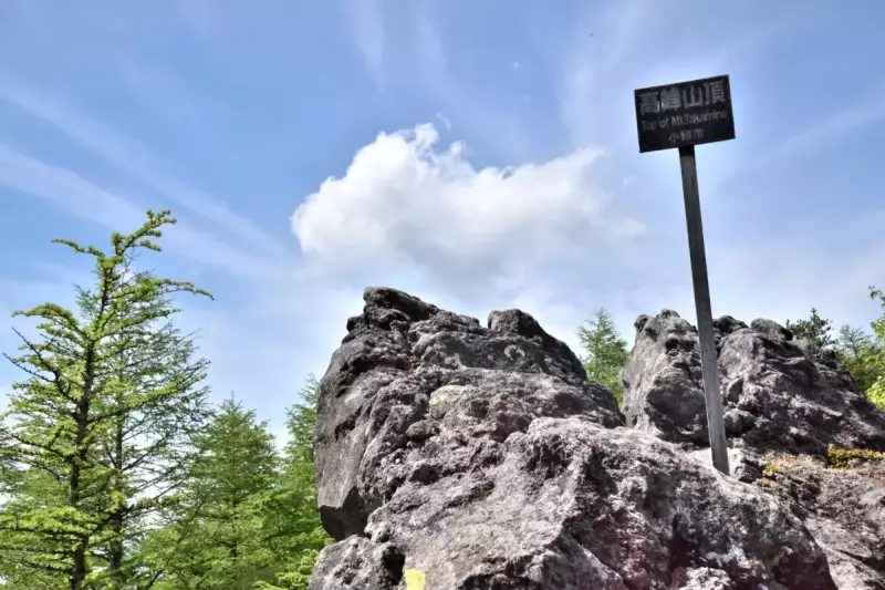 高峰山まではゆるやかな稜線を進みながら黒斑山・前掛山の展望も楽しめます。前方に見える大岩を過ぎれば高峰山山頂です。眺望が良いので八ヶ岳や日本アルプスを見ることができます。
