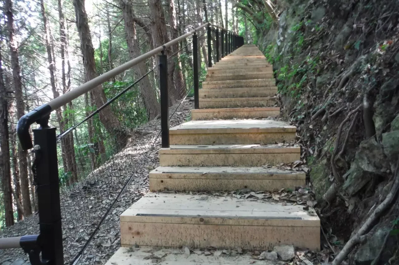 また、木製のステップ・階段を設置する登山道改修工事が行われ、令和5年3月に終了しました。設置された階段の数は合計1,175段に上ります。以前の木の根やゴツゴツした岩肌の上を歩く箇所が少なくなったため、寂しさを感じる登山者もいるようです。