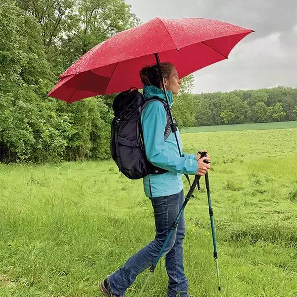 ちなみに、バックパックが濡れないように後ろが長く、グリップをショルダーハーネスに固定できる傘もあります。EuroSCHIRMのスイングバックアップハンズフリーという商品で、とても気になります。