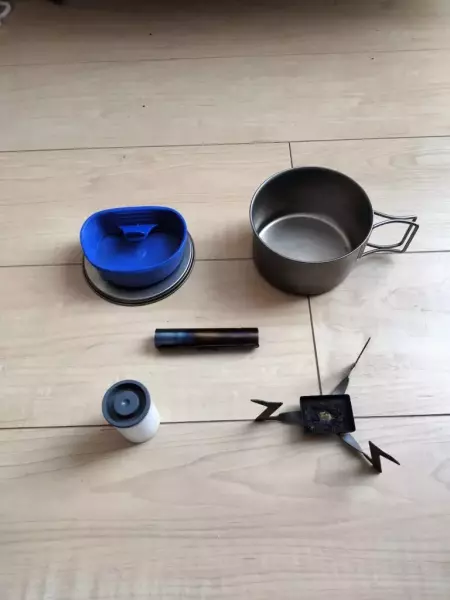 必要最小限の装備にしています。400FD、マルチディッシュ、チタニウムストーブ、チタニウムウィンドスクリーン、フォールダーカップ、固形燃料ケース。合計で119g。