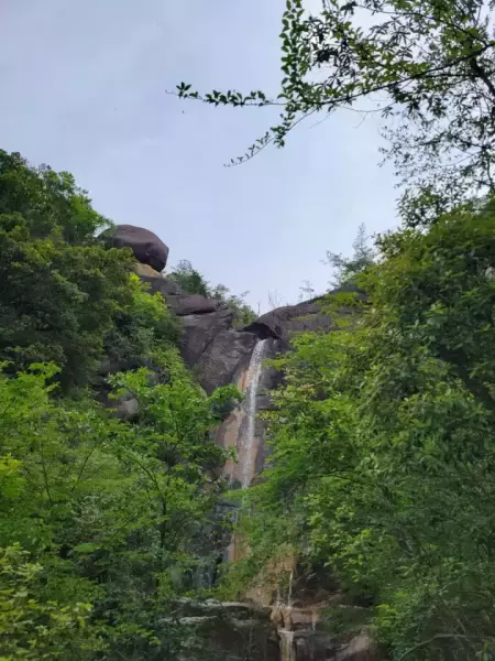 短いものの激登りを越えたら気持ちいい稜線歩き。トレイルは細いものの安定していて歩きやすい。さっきまでいた落ヶ滝を見下ろすお気に入りポイントも。相変わらずヘンテコな形の奇岩。