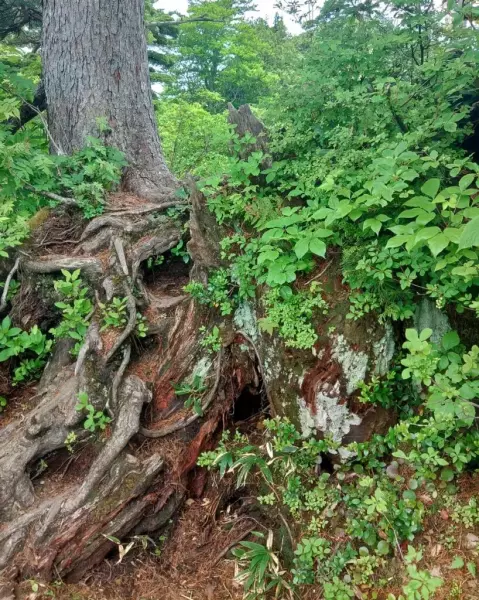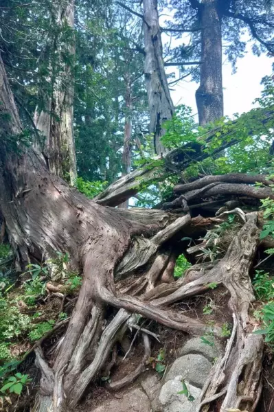 根っこ好きには堪らないでしょう、そびえる根っこのバリケード、登山道です。