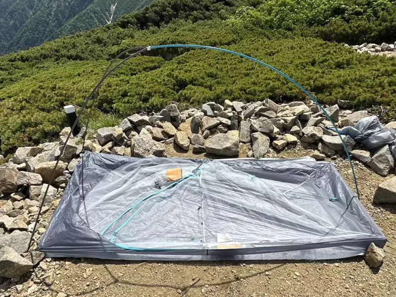 必要最低限の面積でテントを設営できるので、狭いテント場でも柔軟に対応できるのも嬉しいポイントです。
