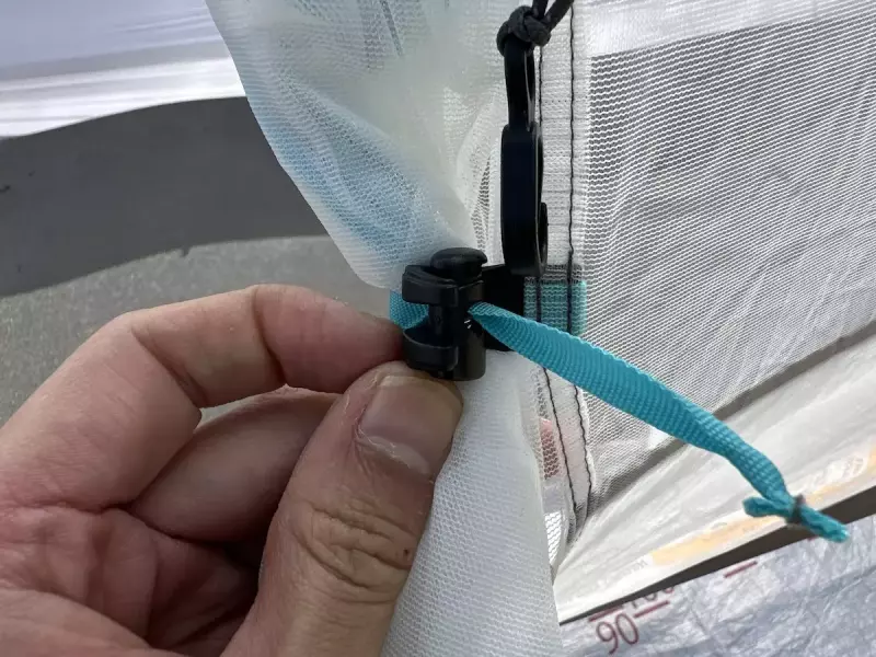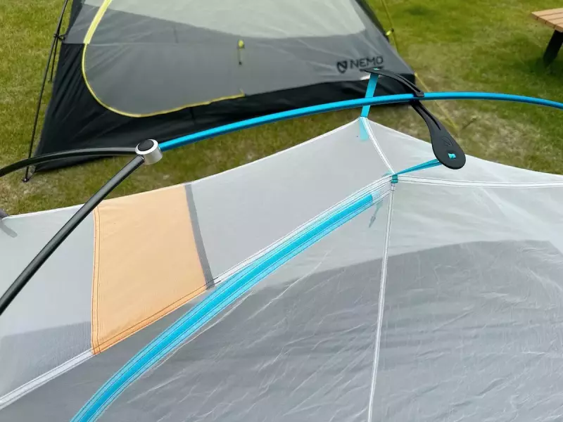 NEMOホーネットエリートオズモ1Pは吊り下げ式テントです。スリーブ式と比較するとどうしてもインナーテント内の空間が狭くなりがちですが、NEMO独自のクリップがインナーテントの最も高いところに設けられ、天井部分を広げることができます。なので吊り下げ式テントだけれども居住空間が広く、テント内で過ごしやすく設計されています。