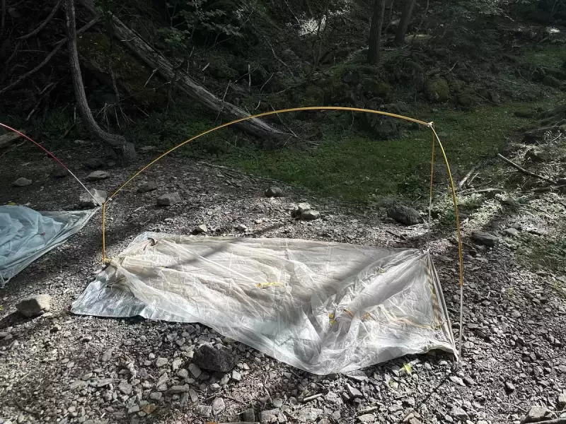 テントの設営方法は非常にシンプルで、ポールを組み立てたらインナーテント本体の3つのポイントにポールを指して、インナーテントのフックをポールに引っ掛けて自立します。