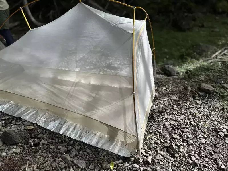インナーテントの足側の角はガイラインを使ってテンションをかけることでバスタブが立ち上がるように作られています。最後にフライシートをインナーテントの上からかけて必要な箇所にペグダウンをして設営完了です。慣れればおおよそ5〜10分程度で設営を終わらすことができます。