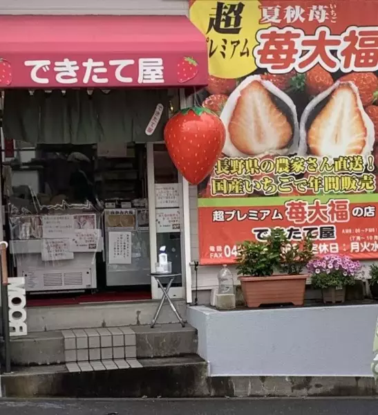 京急長沢駅前の和菓子店。1年中食べられるイチゴ大福が絶品です。5月末までは地元津久井浜の朝摘みイチゴを使用しています。