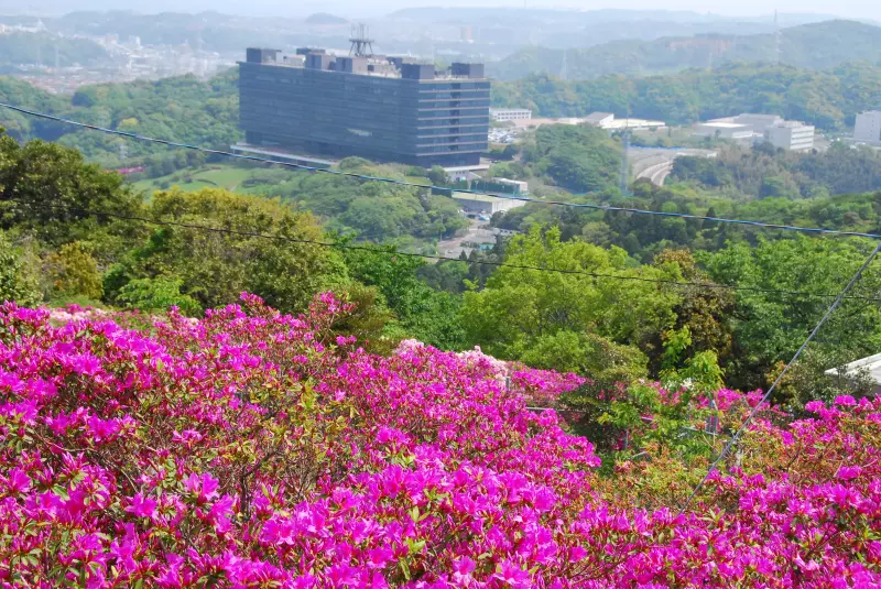 武山山頂には休憩所を兼ねた展望台があります。NTT通信研究所の黒いビルがそびえ立ち、東京湾や海ほたるなどが一望できます。また4月から5月にかけては約1200本のツツジが咲き、訪れる人を楽しませてくれます。