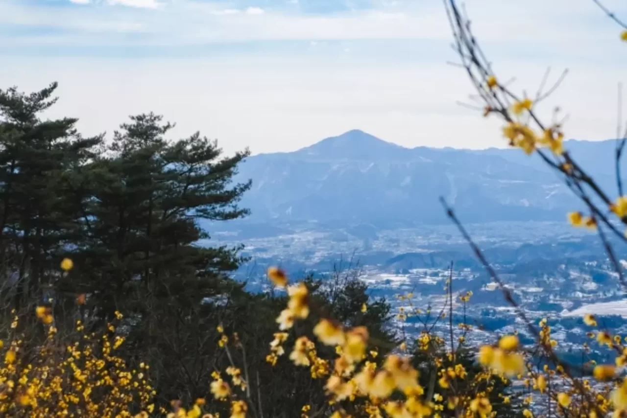 2つ目の魅力は一面に咲き誇るロウバイの花です。山頂には東ロウバイ園と西ロウバイ園の2つがあり、合計面積は5,000平方メートル。広大な敷地に約3000本のロウバイが植えられています。例年12月下旬~2月下旬ごろに見ごろを迎え、冬の澄み渡った青空と黄色い花のコントラストは絶景です。