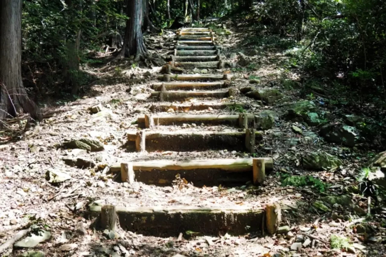 山頂付近に長瀞アルプス最初で最後の難関が待ち受けています。それは約200段の急階段。ここまでゆったりとした山道を歩いてきているため、想像以上にキツいと感じることも。