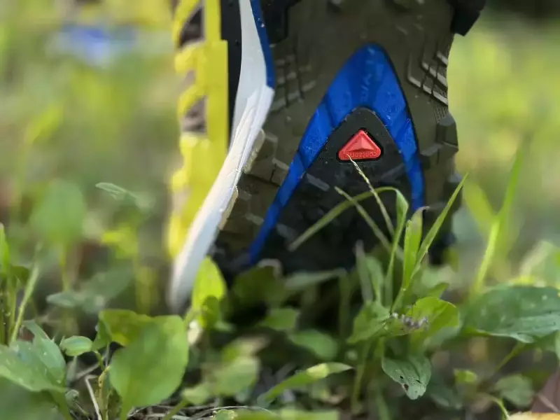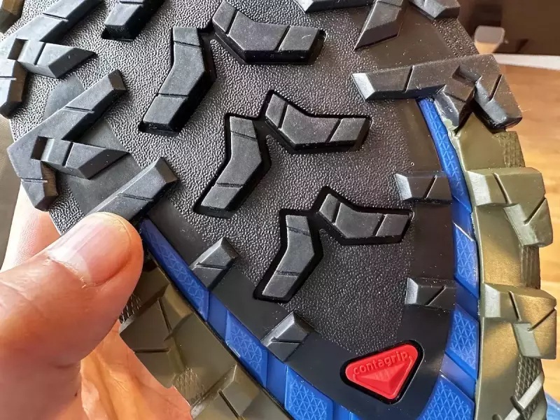 地面に直接接地する素材を触るとアウトソール素材特有の摩擦力と密着性があり、これによって滑りやすい岩場上、木道上でもしっかりとグリップを聞かせて登山をすることが可能です。岩肌の微細な凹凸にもしっかりと食い込み、吸い付くように地面を捉えていることがよく分かります。