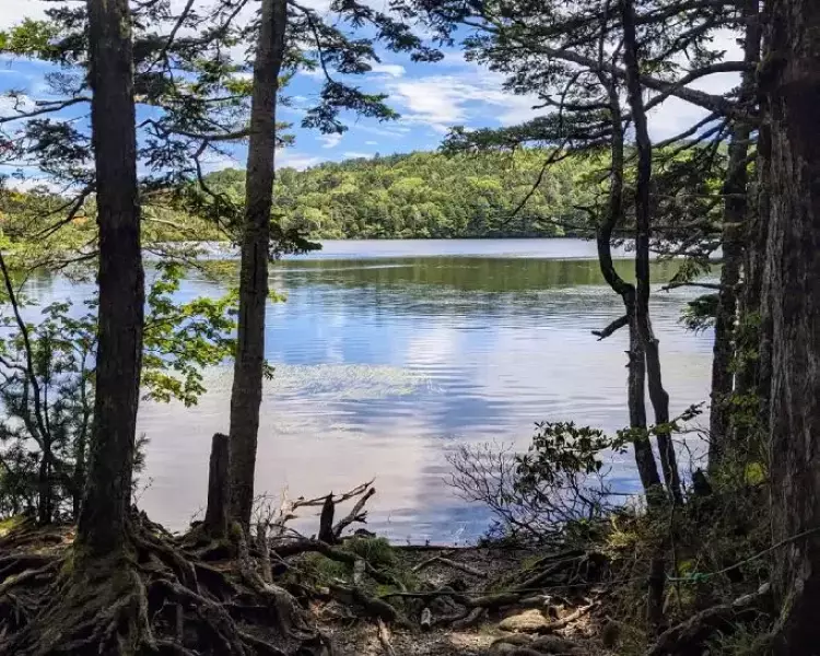森の中に、出発地点付近の白駒池がポツンと見えました。