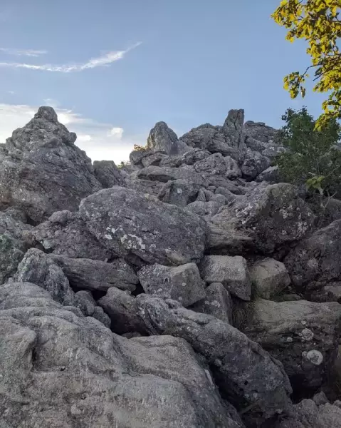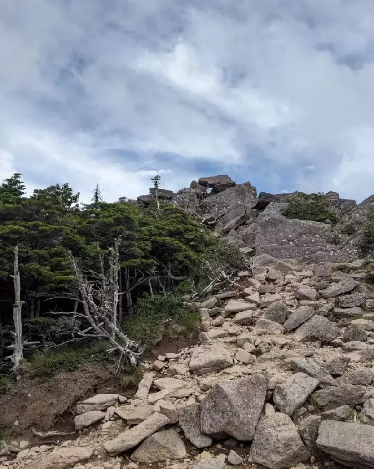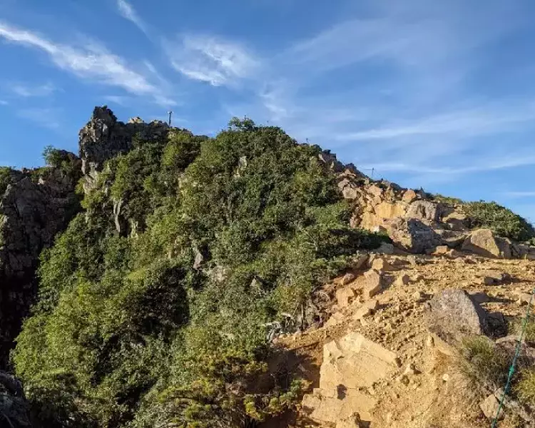 岩が積み上がった場所が見えてきます。あの上が山頂のようです。