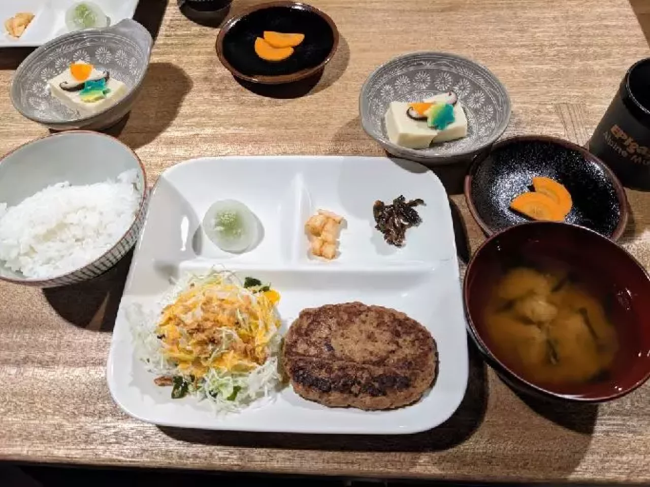 ハンバーグをいただきました。お味噌汁や人参のお漬物、高野豆腐も味わい深くて美味しいです。