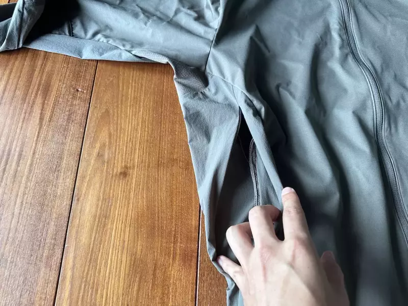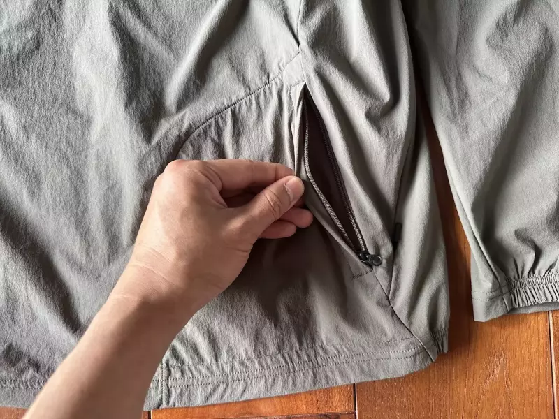 スカイトレイルジャケットには左右にジッパー付きのハンドポケットを備えています。さらに右手の後ろ部分にはストレッチ素材に優れた生地で覆われたジッパー付きポケットがあり行動食などを収納しておくのに便利です。